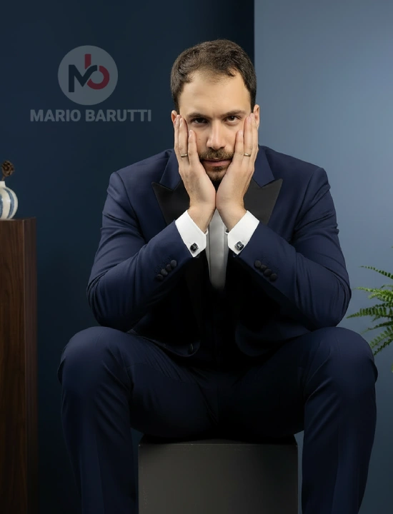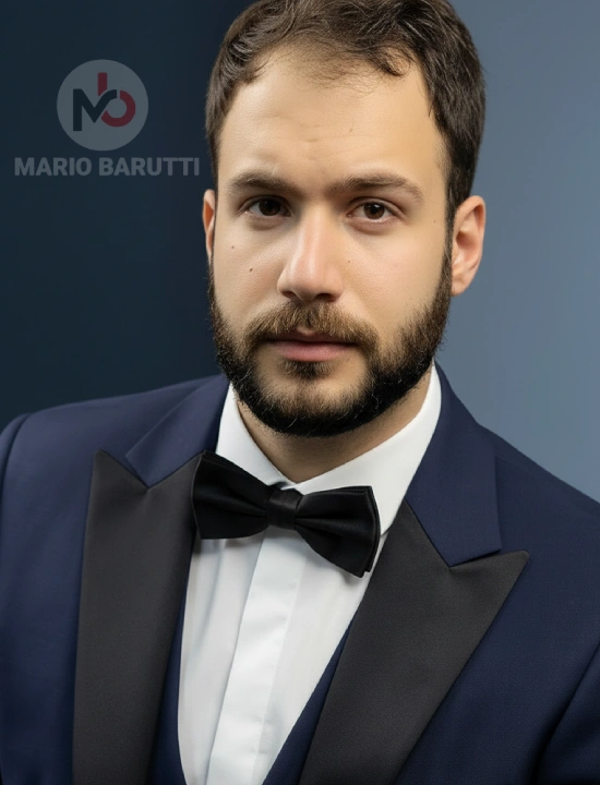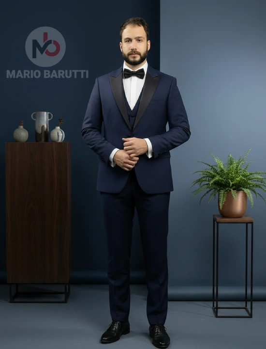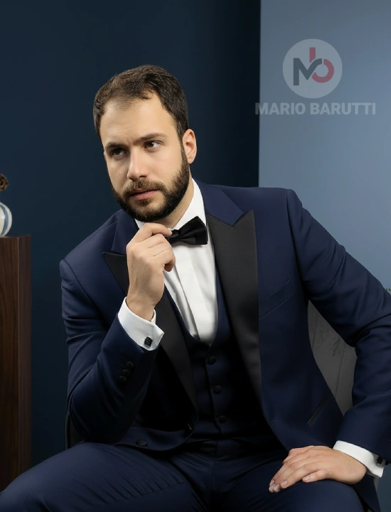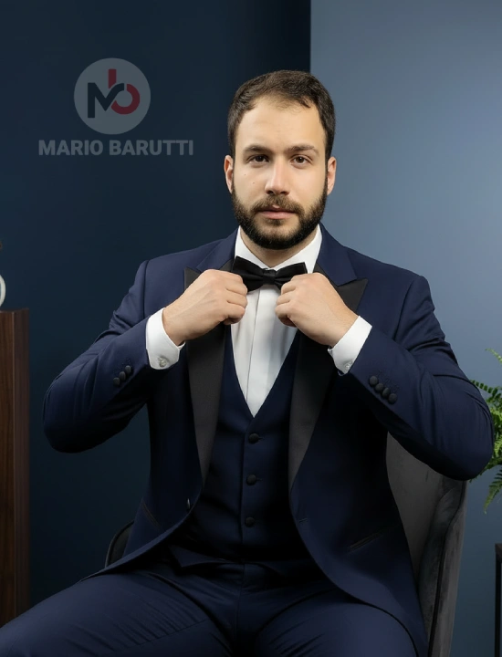 Experience refined tailoring with this Super140 tuxedo from Mario Barutti Tuxedo. Finished in a refined Navy Pointed Collar tone, this suit offers structure, drape and comfort for long days. Ideal for business, weddings and evening occasions.