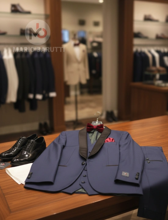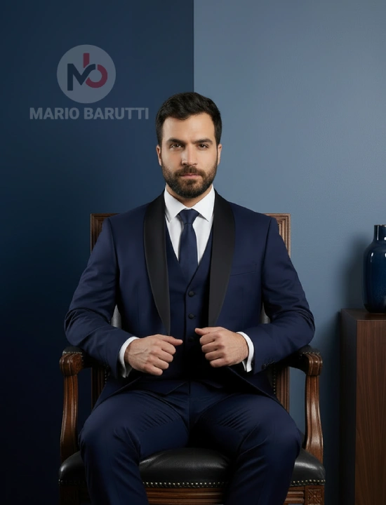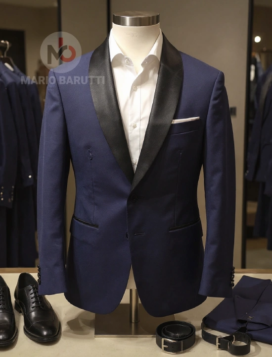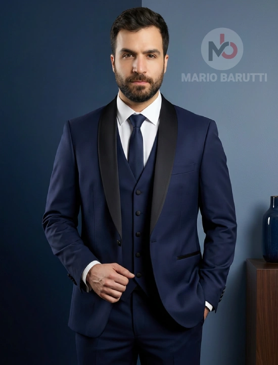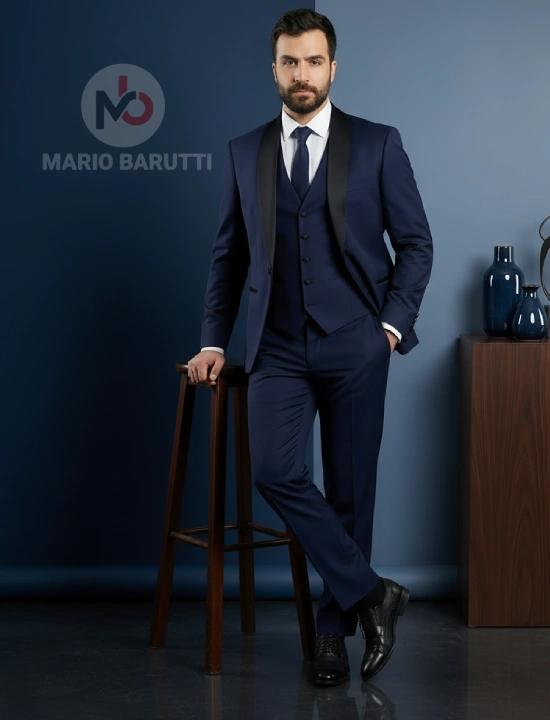 Experience refined tailoring with this Super140 tuxedo from Mario Barutti Tuxedo. Finished in a refined Navy Round collar tone, this suit offers structure, drape and comfort for long days. Ideal for business, weddings and evening occasions.